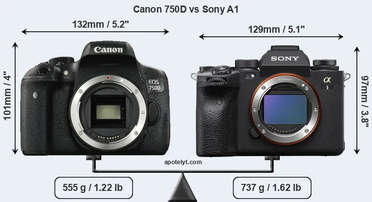 An illustration of the physical size and weight of the Canon 750D and the Sony A1 is provided in the side-by-side display below. The two cameras are presented according to their relative size. Three successive views from the front, the top, and the rear are shown. All size dimensions are rounded to the nearest millimeter.