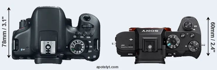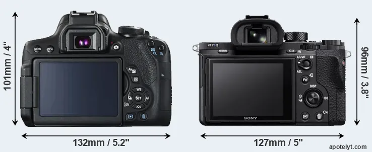 The physical size and weight of the Canon 750D and the Sony A7S II are illustrated in the side-by-side display below. The two cameras are presented according to their relative size. Three successive views from the front, the top, and the rear are shown. All width, height and depth dimensions are rounded to the nearest millimeter.
