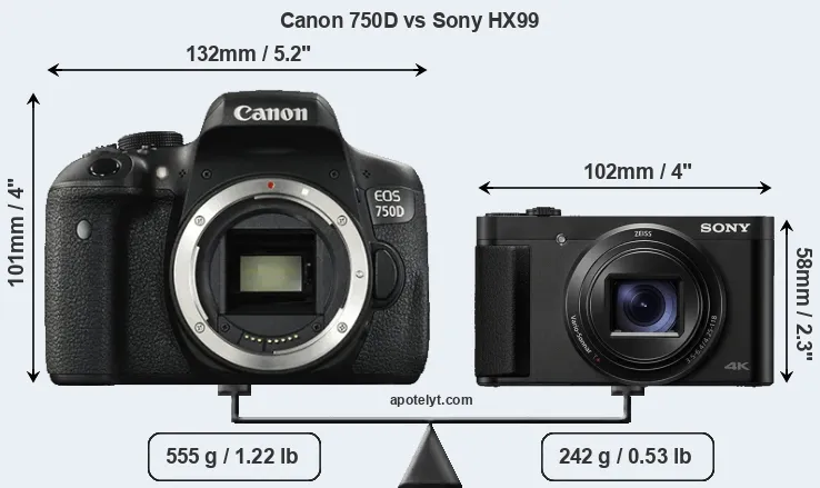 The physical size and weight of the Canon 750D and the Sony HX99 are illustrated in the side-by-side display below. The two cameras are presented according to their relative size. Three consecutive perspectives from the front, the top, and the back are available. All width, height and depth measures are rounded to the nearest millimeter.