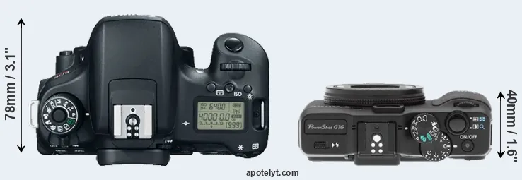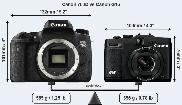 An illustration of the physical size and weight of the Canon 760D and the Canon G16 is provided in the side-by-side display below. The two cameras are presented according to their relative size. Three successive views from the front, the top, and the rear are shown. All width, height and depth measures are rounded to the nearest millimeter.
