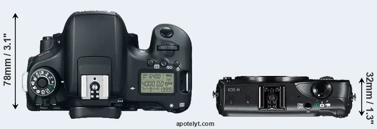 An illustration of the physical size and weight of the Canon 760D and the Canon M is provided in the side-by-side display below. The two cameras are presented according to their relative size. Three consecutive perspectives from the front, the top, and the back are available. All width, height and depth measures are rounded to the nearest millimeter.