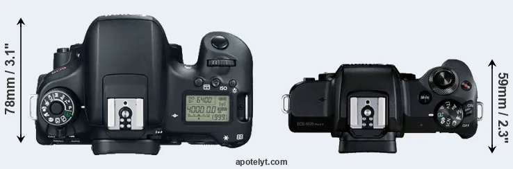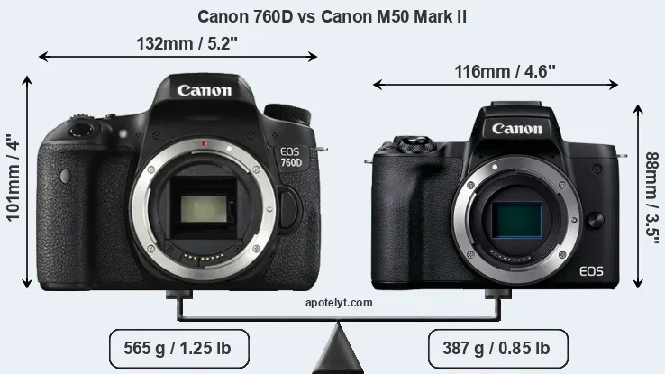 The side-by-side display below illustrates the physical size and weight of the Canon 760D and the Canon M50 Mark II. The two cameras are presented according to their relative size. Three consecutive perspectives from the front, the top, and the back are available. All width, height and depth dimensions are rounded to the nearest millimeter.