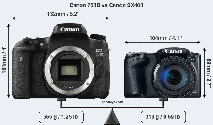 The physical size and weight of the Canon 760D and the Canon SX400 are illustrated in the side-by-side display below. The two cameras are presented according to their relative size. Three successive views from the front, the top, and the rear are shown. All width, height and depth measures are rounded to the nearest millimeter.