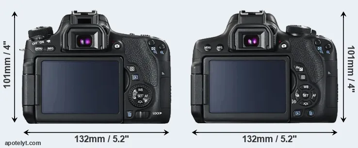 The side-by-side display below illustrates the physical size and weight of the Canon 760D and the Canon T6i. The two cameras are presented according to their relative size. Three consecutive perspectives from the front, the top, and the back are available. All width, height and depth measures are rounded to the nearest millimeter.