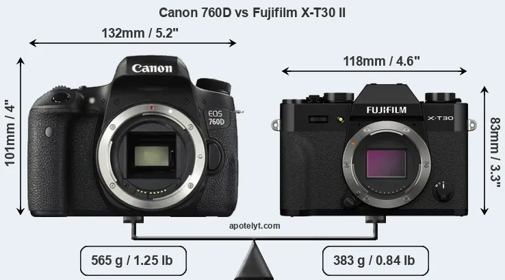 An illustration of the physical size and weight of the Canon 760D and the Fujifilm X-T30 II is provided in the side-by-side display below. The two cameras are presented according to their relative size. Three consecutive perspectives from the front, the top, and the back are available. All size dimensions are rounded to the nearest millimeter.