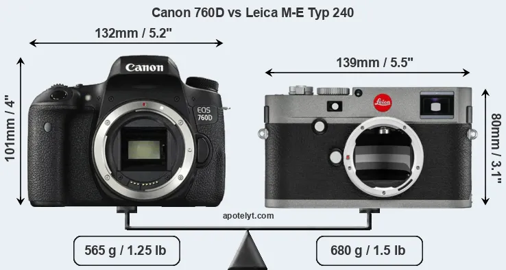 The side-by-side display below illustrates the physical size and weight of the Canon 760D and the Leica M-E Typ 240. The two cameras are presented according to their relative size. Three consecutive perspectives from the front, the top, and the back are available. All width, height and depth measures are rounded to the nearest millimeter.