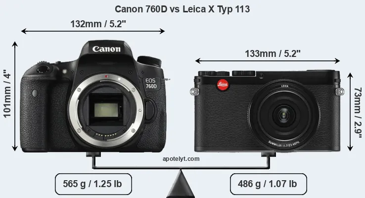 An illustration of the physical size and weight of the Canon 760D and the Leica X Typ 113 is provided in the side-by-side display below. The two cameras are presented according to their relative size. Three consecutive perspectives from the front, the top, and the back are available. All size dimensions are rounded to the nearest millimeter.