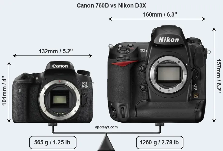 An illustration of the physical size and weight of the Canon 760D and the Nikon D3X is provided in the side-by-side display below. The two cameras are presented according to their relative size. Three consecutive perspectives from the front, the top, and the back are available. All size dimensions are rounded to the nearest millimeter.