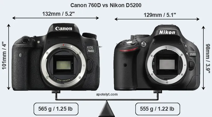 The side-by-side display below illustrates the physical size and weight of the Canon 760D and the Nikon D5200. The two cameras are presented according to their relative size. Three consecutive views from the front, the top, and the rear side are shown. All width, height and depth measures are rounded to the nearest millimeter.
