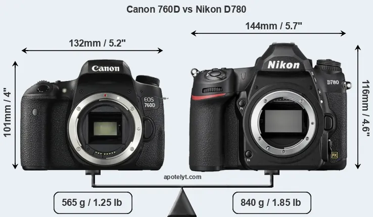 An illustration of the physical size and weight of the Canon 760D and the Nikon D780 is provided in the side-by-side display below. The two cameras are presented according to their relative size. Three consecutive perspectives from the front, the top, and the back are available. All width, height and depth dimensions are rounded to the nearest millimeter.
