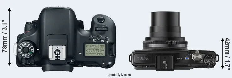 The physical size and weight of the Canon 760D and the Olympus XZ-1 are illustrated in the side-by-side display below. The two cameras are presented according to their relative size. Three consecutive perspectives from the front, the top, and the back are available. All width, height and depth measures are rounded to the nearest millimeter.