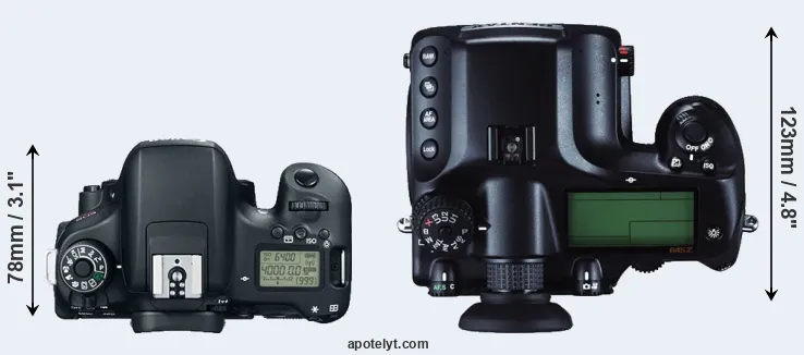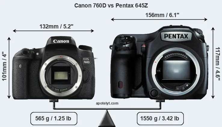 The physical size and weight of the Canon 760D and the Pentax 645Z are illustrated in the side-by-side display below. The two cameras are presented according to their relative size. Three consecutive perspectives from the front, the top, and the back are available. All size dimensions are rounded to the nearest millimeter.