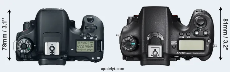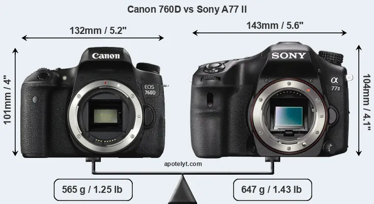 The physical size and weight of the Canon 760D and the Sony A77 II are illustrated in the side-by-side display below. The two cameras are presented according to their relative size. Three successive views from the front, the top, and the rear are shown. All width, height and depth measures are rounded to the nearest millimeter.