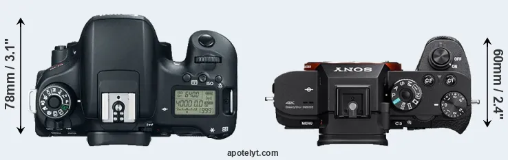 The physical size and weight of the Canon 760D and the Sony A7S II are illustrated in the side-by-side display below. The two cameras are presented according to their relative size. Three successive views from the front, the top, and the rear are shown. All width, height and depth dimensions are rounded to the nearest millimeter.