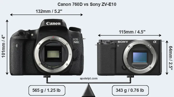 The above size and weight comparisons are to some extent incomplete since they do not consider the interchangeable lenses that both of these cameras require. Both cameras have similarly sized sensors, but DSLRs have a larger flange-to-focal plane distance than mirrorless cameras, which imposes contraints on the optical engineering process and generally leads to bigger and heavier lenses. You can compare the optics available for the two cameras in the Canon EF Lens Catalog (760D) and the Sony E-Mount Lens Catalog (ZV-E10). Mirrorless cameras, such as the ZV-E10, have moreover the advantage that they can use many lenses from other systems via adapters, as they have a relatively short flange to focal plane distance.