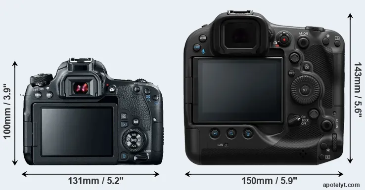 An illustration of the physical size and weight of the Canon 77D and the Canon R3 is provided in the side-by-side display below. The two cameras are presented according to their relative size. Three consecutive views from the front, the top, and the rear side are shown. All width, height and depth measures are rounded to the nearest millimeter.