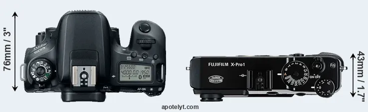 The physical size and weight of the Canon 77D and the Fujifilm X-Pro1 are illustrated in the side-by-side display below. The two cameras are presented according to their relative size. Three successive views from the front, the top, and the rear are shown. All width, height and depth measures are rounded to the nearest millimeter.