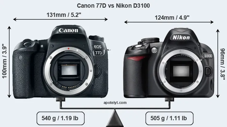 An illustration of the physical size and weight of the Canon 77D and the Nikon D3100 is provided in the side-by-side display below. The two cameras are presented according to their relative size. Three consecutive perspectives from the front, the top, and the back are available. All width, height and depth measures are rounded to the nearest millimeter.