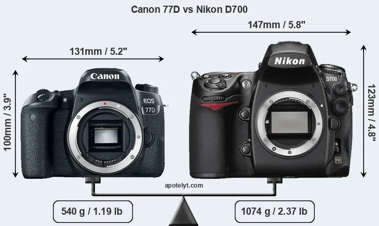 The side-by-side display below illustrates the physical size and weight of the Canon 77D and the Nikon D700. The two cameras are presented according to their relative size. Three successive views from the front, the top, and the rear are shown. All width, height and depth measures are rounded to the nearest millimeter.
