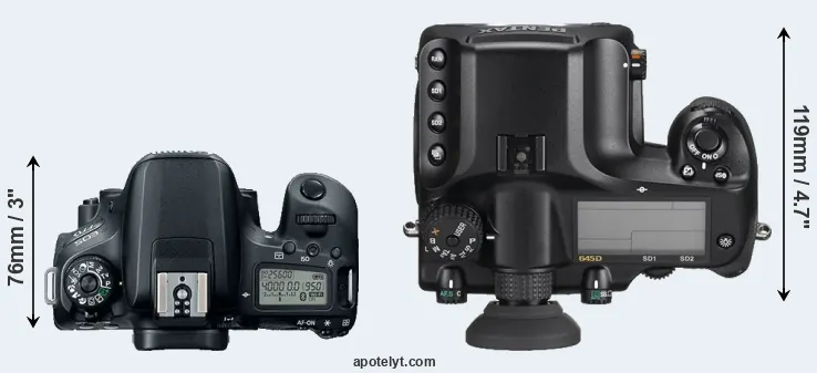 The side-by-side display below illustrates the physical size and weight of the Canon 77D and the Pentax 645D. The two cameras are presented according to their relative size. Three successive views from the front, the top, and the rear are shown. All size dimensions are rounded to the nearest millimeter.