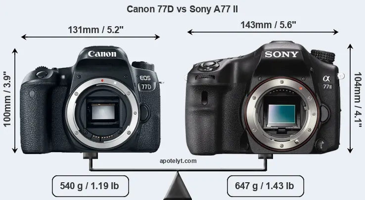 If the front view area (width x height) of the cameras is taken as an aggregate measure of their size, the Sony A77 II is notably larger (14 percent) than the Canon 77D. Moreover, the A77 II is markedly heavier (20 percent) than the 77D. It is noteworthy in this context that the A77 II is splash and dust-proof, while the 77D does not feature any corresponding weather-sealing.