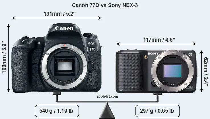 The side-by-side display below illustrates the physical size and weight of the Canon 77D and the Sony NEX-3. The two cameras are presented according to their relative size. Three consecutive views from the front, the top, and the rear side are shown. All width, height and depth dimensions are rounded to the nearest millimeter.