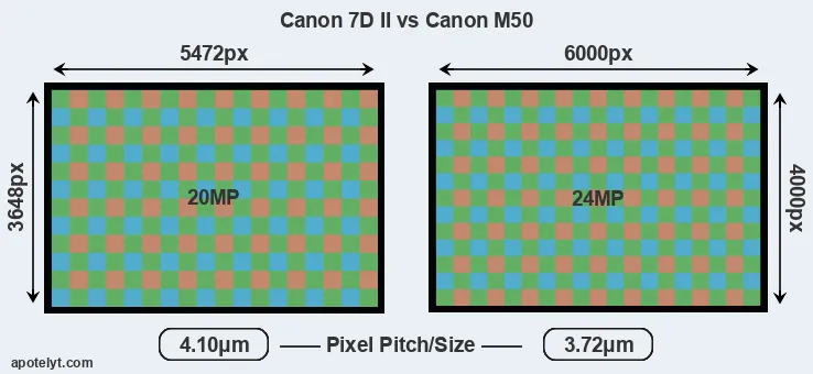 Despite having a slightly smaller sensor, the M50 offers a higher resolution of 24 megapixels, compared with 20 MP of the 7D Mark II. This megapixels advantage comes at the cost of a higher pixel density and a smaller size of the individual pixel (with a pixel pitch of 3.72μm versus 4.10μm for the 7D Mark II). However, it should be noted that the M50 is much more recent (by 3 years and 5 months) than the 7D Mark II, and its sensor will have benefitted from technological advances during this time that make it possible to gather light more efficiently.
