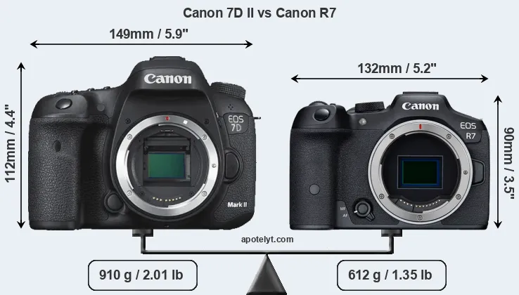 The physical size and weight of the Canon 7D II and the Canon R7 are illustrated in the side-by-side display below. The two cameras are presented according to their relative size. Three successive views from the front, the top, and the rear are shown. All width, height and depth dimensions are rounded to the nearest millimeter.