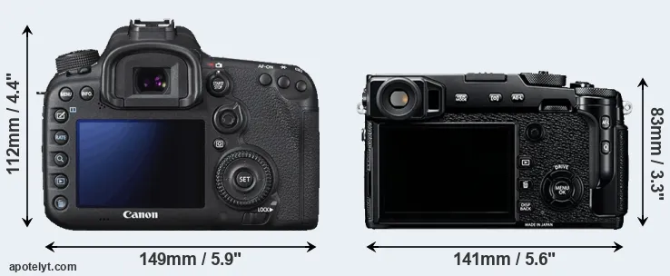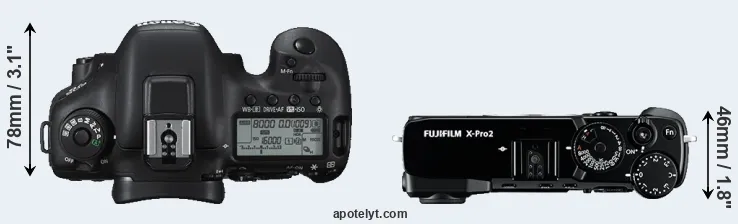The side-by-side display below illustrates the physical size and weight of the Canon 7D II and the Fujifilm X-Pro2. The two cameras are presented according to their relative size. Three consecutive perspectives from the front, the top, and the back are available. All width, height and depth measures are rounded to the nearest millimeter.