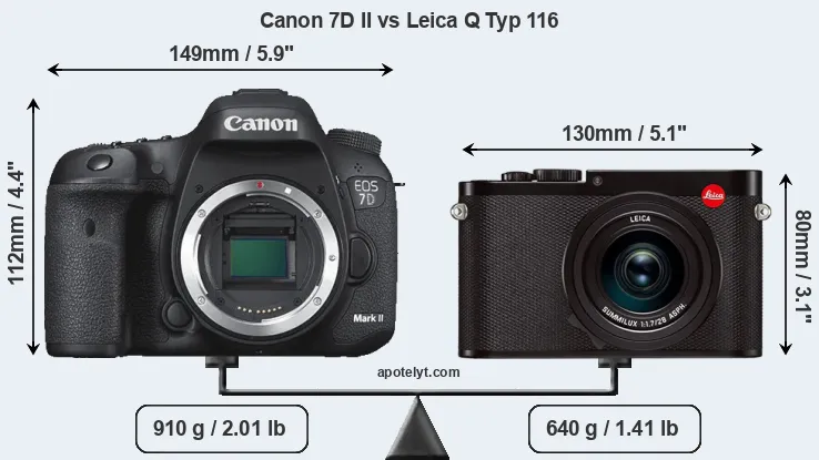 If the front view area (width x height) of the cameras is taken as an aggregate measure of their size, the Leica Q Typ 116 is considerably smaller (38 percent) than the Canon 7D II. It is worth mentioning in this context that the 7D Mark II is splash and dust resistant, while the Q Typ 116 does not feature any corresponding weather-sealing.