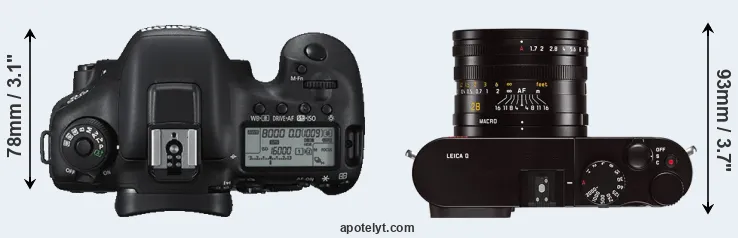 The physical size and weight of the Canon 7D II and the Leica Q Typ 116 are illustrated in the side-by-side display below. The two cameras are presented according to their relative size. Three consecutive views from the front, the top, and the rear side are shown. All width, height and depth dimensions are rounded to the nearest millimeter.