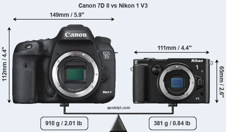 The side-by-side display below illustrates the physical size and weight of the Canon 7D II and the Nikon 1 V3. The two cameras are presented according to their relative size. Three consecutive perspectives from the front, the top, and the back are available. All width, height and depth measures are rounded to the nearest millimeter.