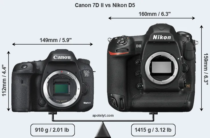 If the front view area (width x height) of the cameras is taken as an aggregate measure of their size, the Nikon D5 is considerably larger (52 percent) than the Canon 7D II. Moreover, the D5 is substantially heavier (55 percent) than the 7D Mark II. In this context, it is worth noting that both cameras are splash and dust-proof and can, hence, be used in inclement weather conditions or harsh environments.