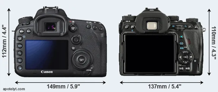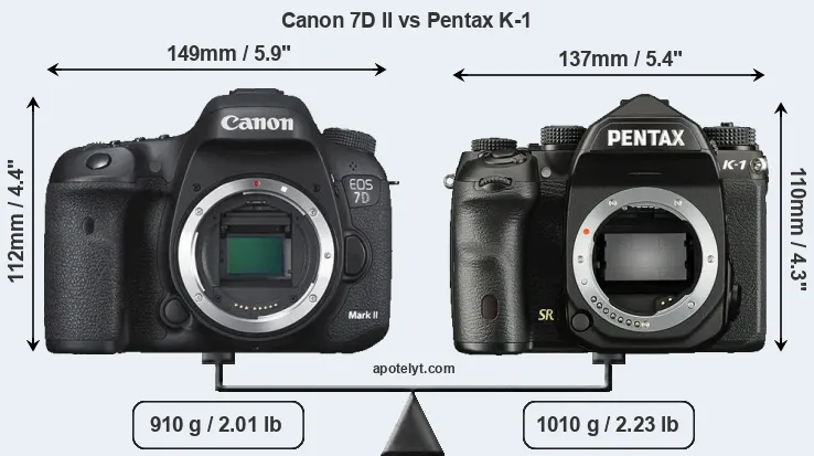 The physical size and weight of the Canon 7D II and the Pentax K-1 are illustrated in the side-by-side display below. The two cameras are presented according to their relative size. Three consecutive perspectives from the front, the top, and the back are available. All width, height and depth dimensions are rounded to the nearest millimeter.