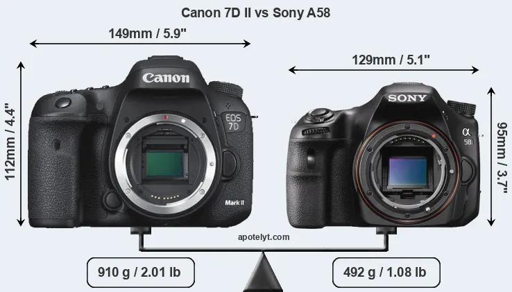If the front view area (width x height) of the cameras is taken as an aggregate measure of their size, the Sony A58 is notably smaller (27 percent) than the Canon 7D II. Moreover, the A58 is substantially lighter (46 percent) than the 7D Mark II. It is worth mentioning in this context that the 7D Mark II is splash and dust resistant, while the A58 does not feature any corresponding weather-sealing.