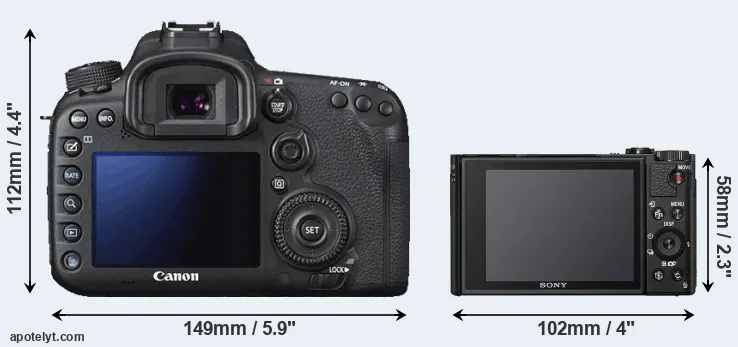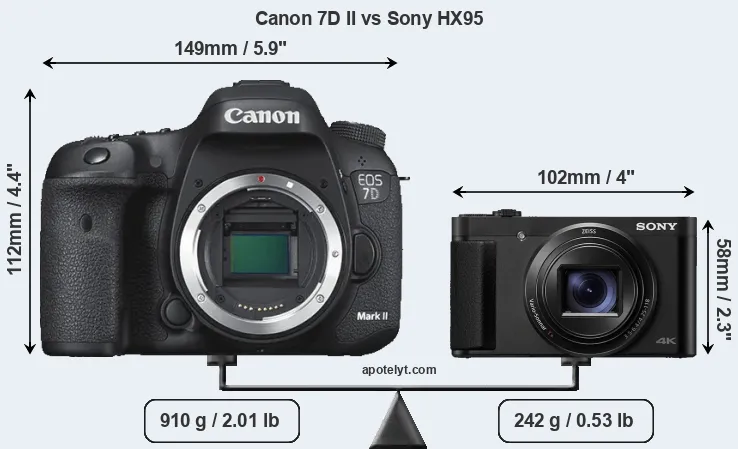 The side-by-side display below illustrates the physical size and weight of the Canon 7D II and the Sony HX95. The two cameras are presented according to their relative size. Three consecutive views from the front, the top, and the rear side are shown. All width, height and depth dimensions are rounded to the nearest millimeter.
