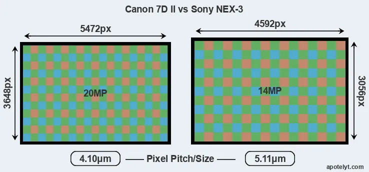 Despite having a smaller sensor, the Canon 7D II offers a higher resolution of 20 megapixels, compared with 14 MP of the Sony NEX-3. This megapixels advantage comes at the cost of a higher pixel density and a smaller size of the individual pixel (with a pixel pitch of 4.10μm versus 5.11μm for the NEX-3). However, it should be noted that the 7D Mark II is much more recent (by 4 years and 4 months) than the NEX-3, and its sensor will have benefitted from technological advances during this time that make it possible to gather light more efficiently.