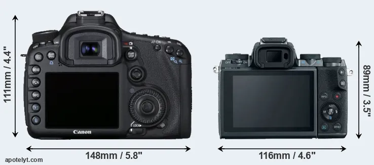 An illustration of the physical size and weight of the Canon 7D and the Canon M5 is provided in the side-by-side display below. The two cameras are presented according to their relative size. Three successive views from the front, the top, and the rear are shown. All width, height and depth measures are rounded to the nearest millimeter.