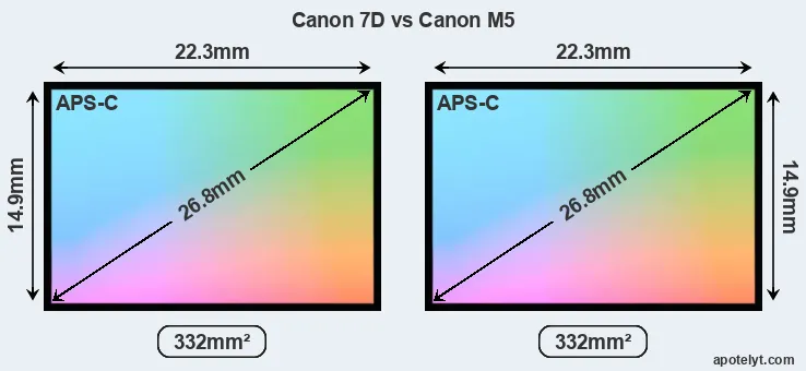While the two cameras under review share the same sensor size, the M5 offers a higher resolution of 24 megapixels, compared with 17.9 MP of the 7D. This megapixels advantage translates into a 16 percent gain in linear resolution. On the other hand, these sensor specs imply that the M5 has a higher pixel density and a smaller size of the individual pixel (with a pixel pitch of 3.72μm versus 4.31μm for the 7D). However, it should be noted that the M5 is much more recent (by 7 years) than the 7D, and its sensor will have benefitted from technological advances during this time that compensate for the smaller pixel size.