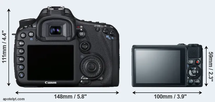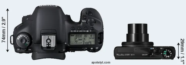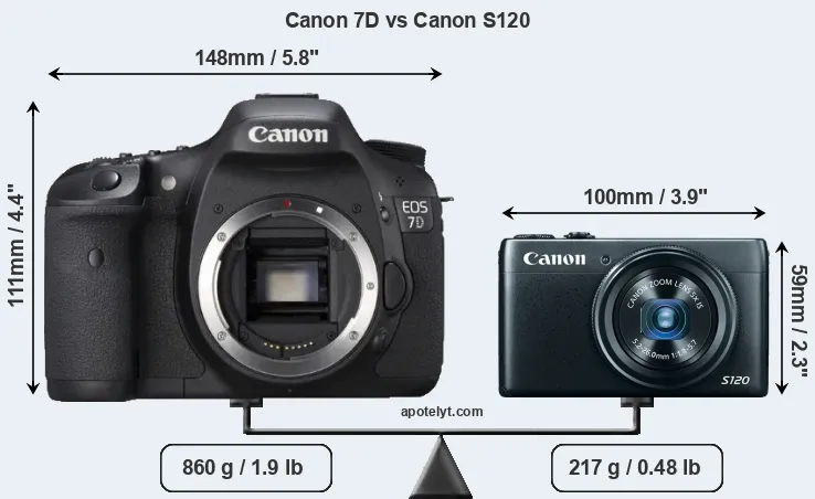 An illustration of the physical size and weight of the Canon 7D and the Canon S120 is provided in the side-by-side display below. The two cameras are presented according to their relative size. Three successive views from the front, the top, and the rear are shown. All width, height and depth dimensions are rounded to the nearest millimeter.