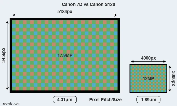 With 17.9MP, the 7D offers a higher resolution than the S120 (12MP), but the 7D nevertheless has larger individual pixels (pixel pitch of 4.31μm versus 1.89μm for the S120) due to its larger sensor. However, the S120 is a much more recent model (by 3 years and 11 months) than the 7D, and its sensor will have benefitted from technological advances during this time that further enhance the light gathering capacity of its pixels.