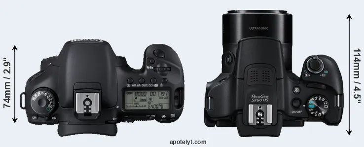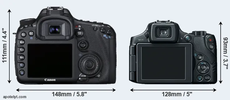 The physical size and weight of the Canon 7D and the Canon SX60 are illustrated in the side-by-side display below. The two cameras are presented according to their relative size. Three successive views from the front, the top, and the rear are shown. All width, height and depth dimensions are rounded to the nearest millimeter.