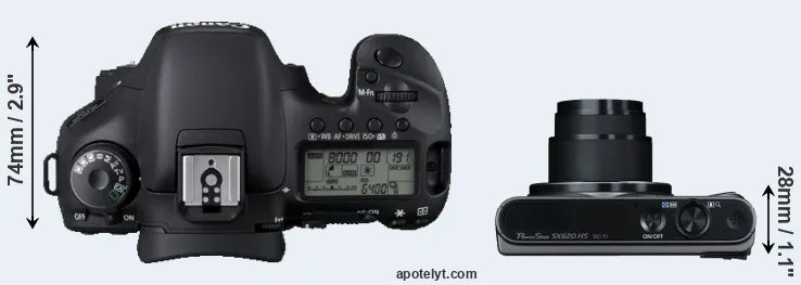 The side-by-side display below illustrates the physical size and weight of the Canon 7D and the Canon SX620. The two cameras are presented according to their relative size. Three consecutive perspectives from the front, the top, and the back are available. All width, height and depth measures are rounded to the nearest millimeter.
