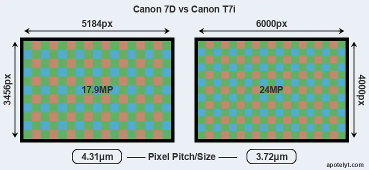 While the two cameras under review share the same sensor size, the T7i offers a higher resolution of 24 megapixels, compared with 17.9 MP of the 7D. This megapixels advantage translates into a 16 percent gain in linear resolution. On the other hand, these sensor specs imply that the T7i has a higher pixel density and a smaller size of the individual pixel (with a pixel pitch of 3.72μm versus 4.31μm for the 7D). However, it should be noted that the T7i is much more recent (by 7 years and 5 months) than the 7D, and its sensor will have benefitted from technological advances during this time that compensate for the smaller pixel size.