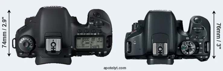 The side-by-side display below illustrates the physical size and weight of the Canon 7D and the Canon T7i. The two cameras are presented according to their relative size. Three successive views from the front, the top, and the rear are shown. All size dimensions are rounded to the nearest millimeter.