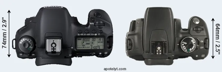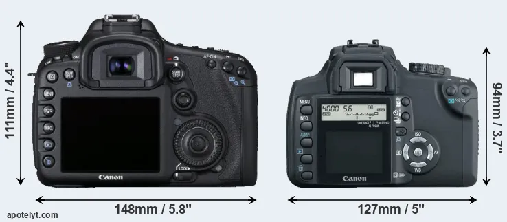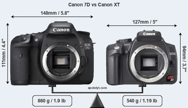 The physical size and weight of the Canon 7D and the Canon XT are illustrated in the side-by-side display below. The two cameras are presented according to their relative size. Three consecutive perspectives from the front, the top, and the back are available. All width, height and depth dimensions are rounded to the nearest millimeter.