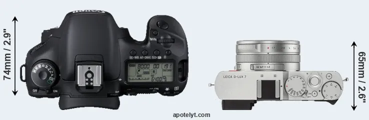 An illustration of the physical size and weight of the Canon 7D and the Leica D-LUX 7 is provided in the side-by-side display below. The two cameras are presented according to their relative size. Three consecutive perspectives from the front, the top, and the back are available. All width, height and depth measures are rounded to the nearest millimeter.