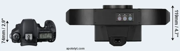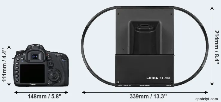 The physical size and weight of the Canon 7D and the Leica S1 are illustrated in the side-by-side display below. The two cameras are presented according to their relative size. Three consecutive views from the front, the top, and the rear side are shown. All size dimensions are rounded to the nearest millimeter.