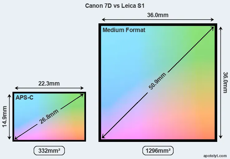 Of the two cameras under consideration, the Canon 7D features an APS-C sensor and the Leica S1 a medium format sensor. The sensor area in the S1 is 290 percent bigger. As a result of these sensor size differences, the cameras have a format factor of, respectively, 1.6 and 0.85. The sensor in the 7D has a native 3:2 aspect ratio, while the one in the S1 offers a 1:1 aspect.