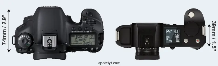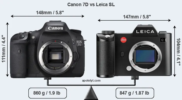 The side-by-side display below illustrates the physical size and weight of the Canon 7D and the Leica SL. The two cameras are presented according to their relative size. Three consecutive views from the front, the top, and the rear side are shown. All width, height and depth measures are rounded to the nearest millimeter.